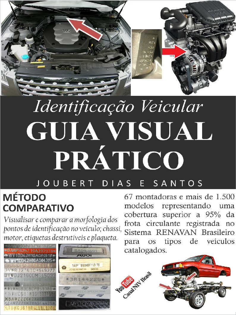 Nesta literatura técnica inédita, você poderá vislumbrar a localização do numeral do chassi e do motor para 67 montadoras em mais de 1500 modelos de veículos catalogados, estes possibilitam uma amplitude de até 95% da frota registrada no Registro Nacional de Veículos Automotores (RENAVAN). Esta ferramenta foi idealizada e desenvolvida por um profissional da área, com mais de 18 anos de atividade, tem por objetivo auxiliar a todos que atuam na identificação veicular sendo uma fonte fidedigna para comparar aquilo que estiver sendo avaliado/vistoriado, possui uma gama ilustrada entre chassi, motor, etiquetas e plaquetas possibilitando a vista comparativa.